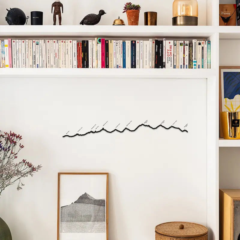 La silhouette murale The Line Domaine des 3 Vallées en acier est une décoration murale unique. Laissez vous séduire par la représentation de la beauté naturelle de cette région, représentée depuis l'Ouest. On y voit le Signal, l'Aiguille du Fruit, le Mont Vallon, l'aiguille de Pédet, la pointe de Thorens et de la Masse et bien évidemment le sommet des 3 Vallées et la cime Caron.
